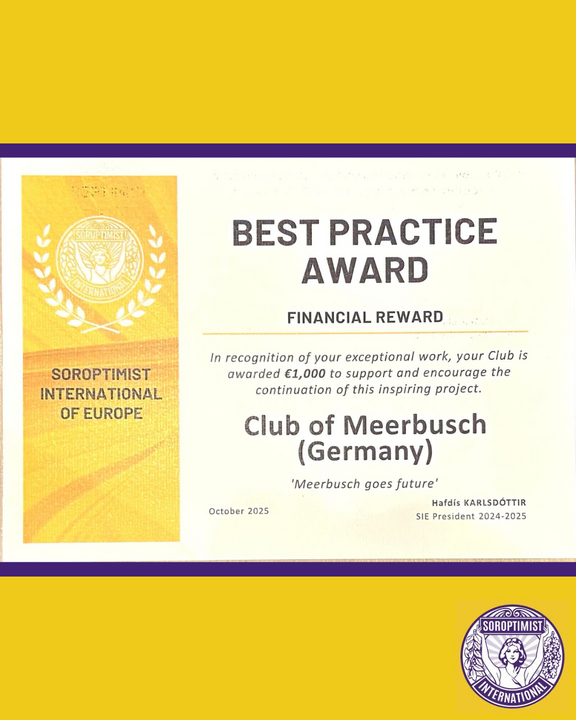 Für unsere Klimaschutz-Initiative Meerbusch goes Future hat der Soroptimist International-Club Meerbusch bei den SIE Best Practice Awards 2025 einen Special Award für die Förderung der UNNachhaltigkeitsziele gewonnen! Das haben die Mitglieder des SI-Europa-Programm- und Vorstandsteams im Rahmen des Europa-Kongress 2025 in Krakau (Polen) entschieden. Dabei hat sich unsere Initiative gegen 134 Mitbewerber durchgesetzt! Ein Ansporn mit vollem Engagement weiterzumachen!